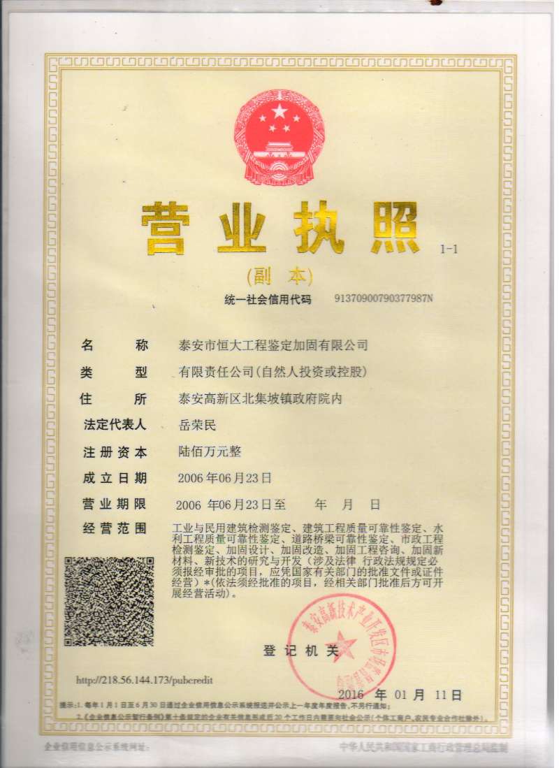 歡迎來到 泰安市恒大工程鑒定加固有限公司!恒大實力工程廠家,專注工程鑒定加固。咨詢熱線: 0538-6391999 | 15605380699